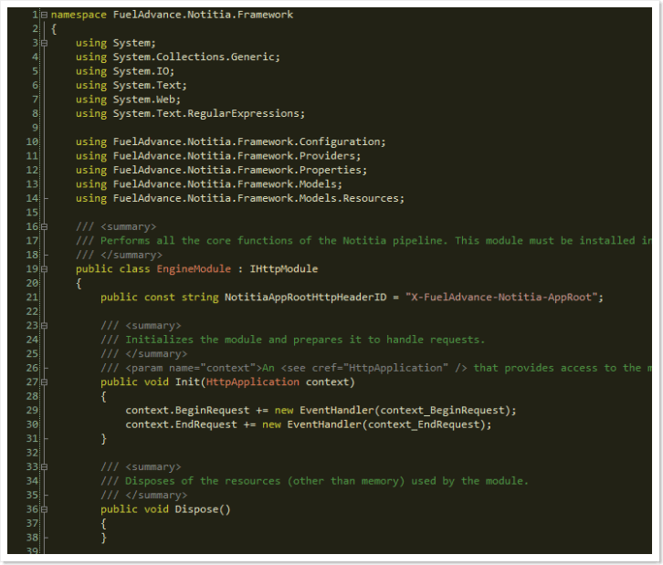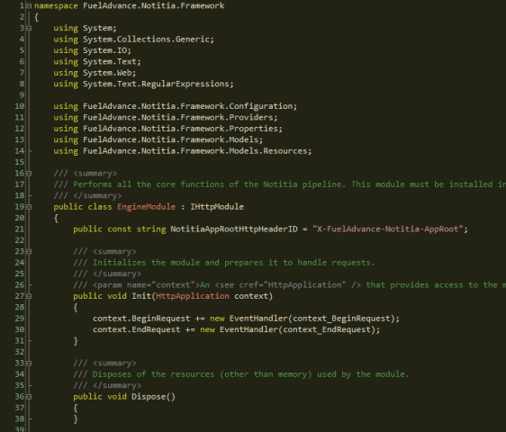 If you want to give it a whirl, download the Consolas font then download the .vssettings file. Keep in mind that this is only a v1 – the C# looks awesome, but I’ve yet to format the XML and HTML. Of course, I haven’t even tested VB.NET as I don’t even have it installed! I’ll post a v2 with colors for everything as soon as I get sick of looking at ugly XML/HTML.