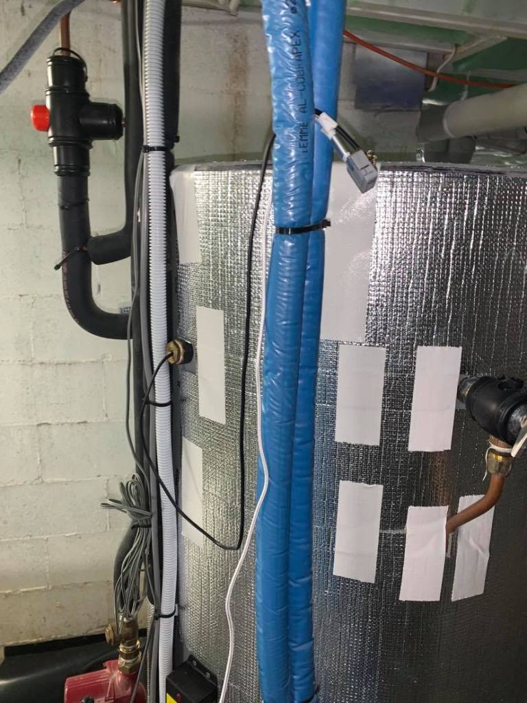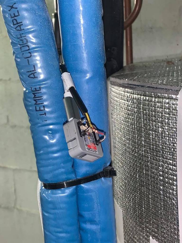 Here, an M5Stack Atom Lite ($6) is combined with a DS18B20 temperature probe (~$2, including 2m cable), a single resistor jammed across two pins, a leftover USB charge cable, and a little bit of electrical tape to hold it all together. For sub-$10, and no soldering, we have a Wi-Fi connected temperature sensor dipped into the hot water system, connected back to Home Assistant.
