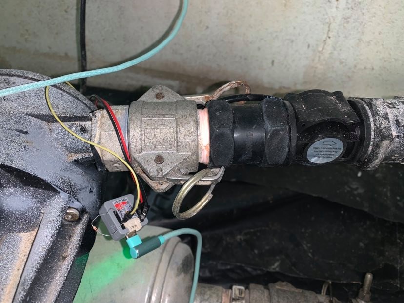 A similar setup connects to a flow meter in-line with a pressure pump. The flow meter draws power (3.3V and ground) straight off the M5Stack. For each litre of water that passes through, it’ll pulse 11 times. A resistor is jammed across the pulse return and ground to remove float noise. The flow sensor can cost anywhere from $5 to $500 depending on what pressure you want to be able to handle, for what type of fluid, and to what accuracy. Ours cost ~$20, so the whole setup was <$30. It’s not the nicest fanciest of engineering, but it was zero soldering, and it hasn’t missed a pulse yet.